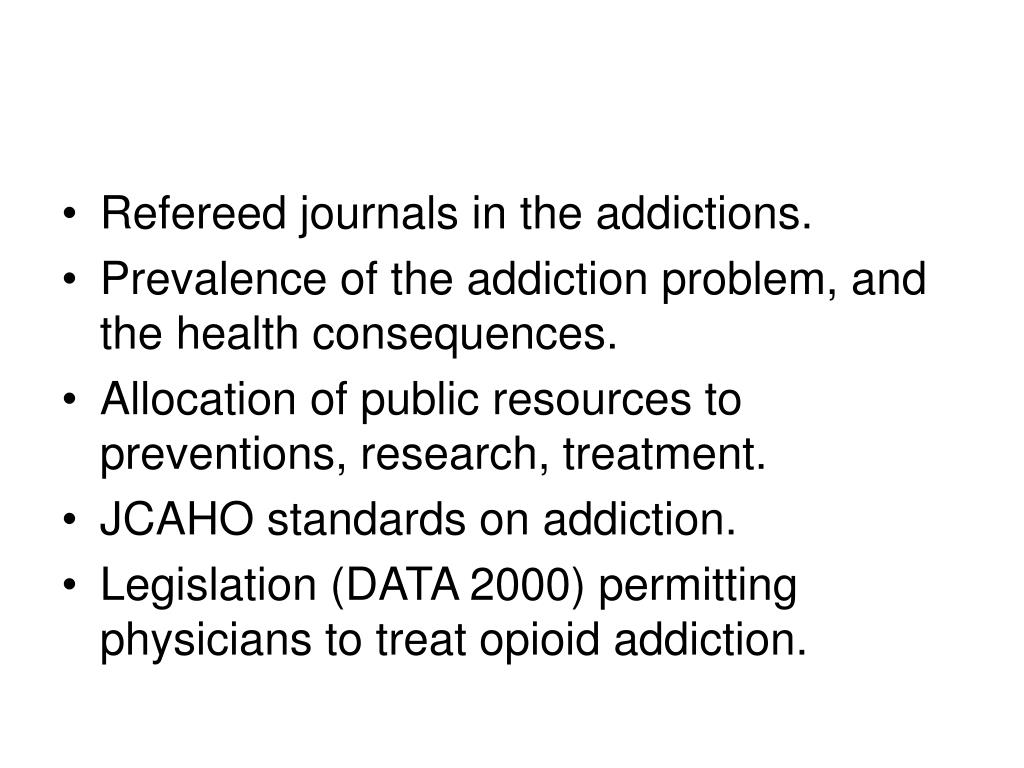 Refereed journals in the addictions. • Prevalence of the addiction problem, and the health consequences. • Allocation of public resources to preventions, research, treatment. • JCAHO standards on addiction. • Legislation (DATA 2000) permitting physicians to treat opioid addiction.