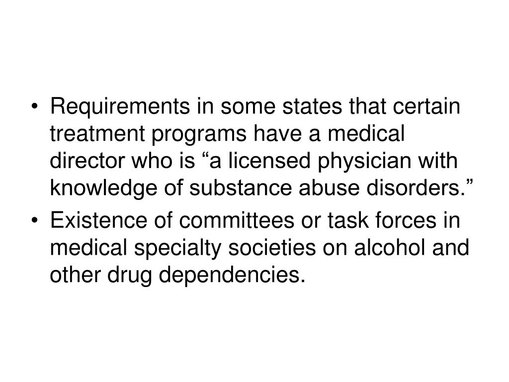 Requirements in some states that certain treatment programs have a medical director who is “a licensed physician with knowledge of substance abuse disorders.” • Existence of committees or task forces in medical specialty societies on alcohol and other drug dependencies.
