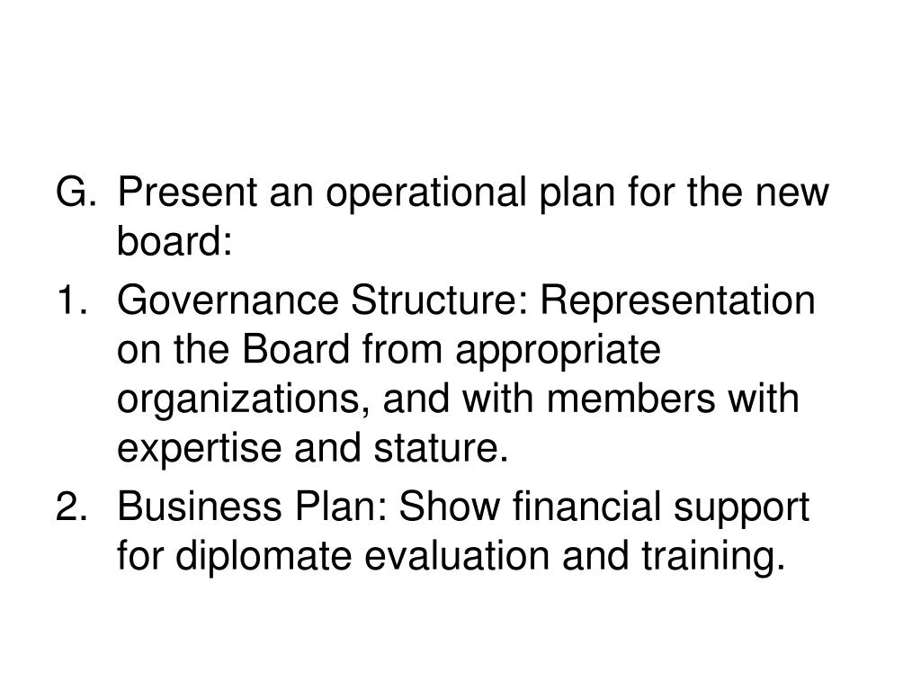 Present an operational plan for the new board: • Governance Structure: Representation on the Board from appropriate organizations, and with members with expertise and stature. • Business Plan: Show financial support for diplomate evaluation and training.
