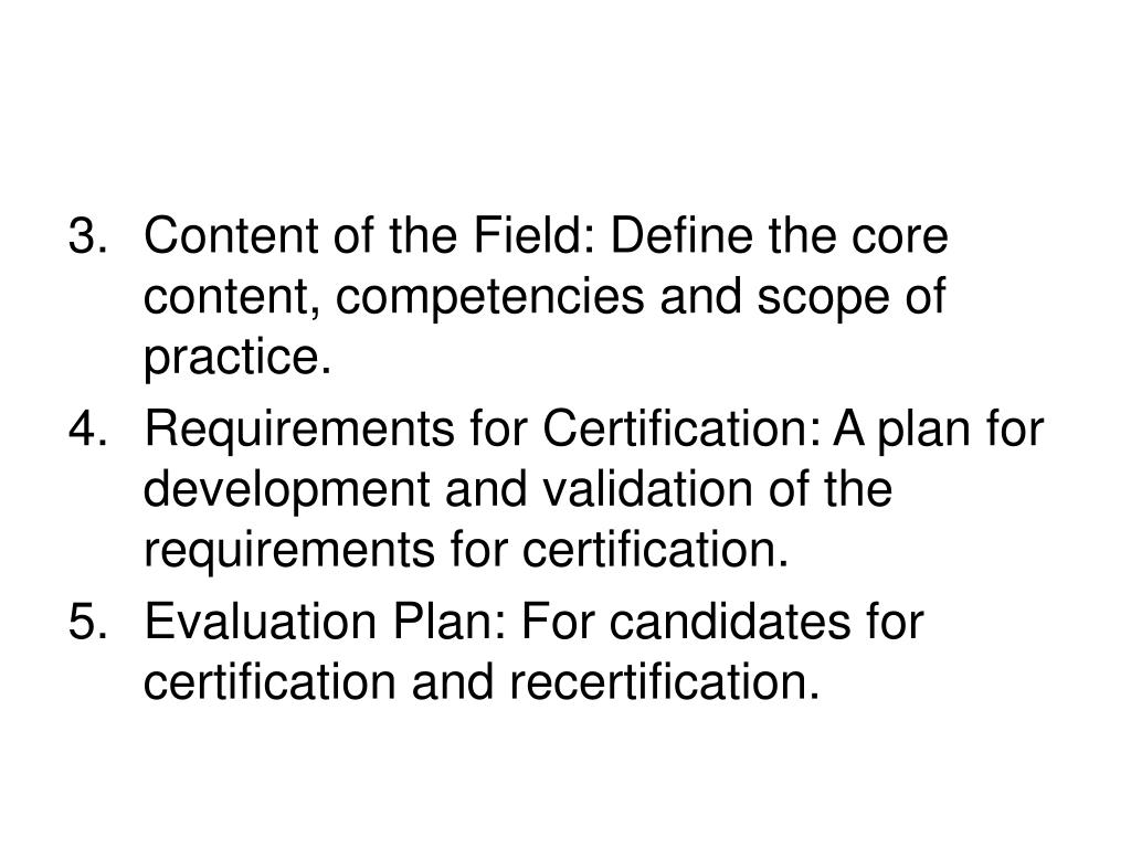 Content of the Field: Define the core content, competencies and scope of practice. • Requirements for Certification: A plan for development and validation of the requirements for certification. • Evaluation Plan: For candidates for certification and recertification.