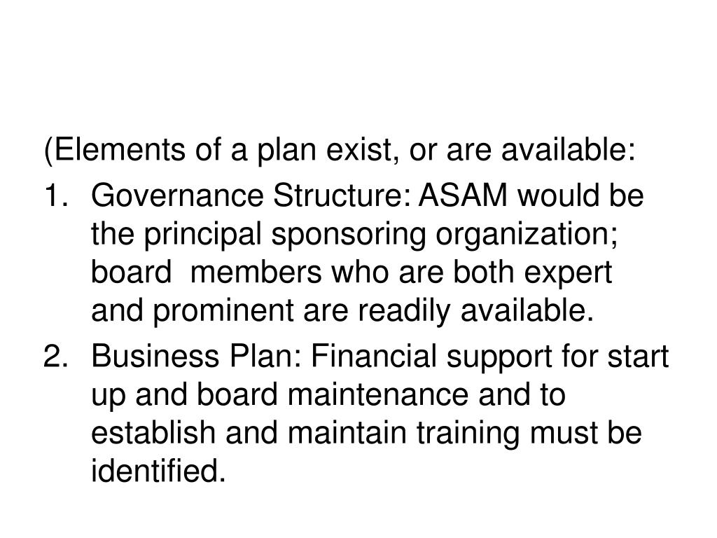 (Elements of a plan exist, or are available: • Governance Structure: ASAM would be the principal sponsoring organization; board members who are both expert and prominent are readily available. • Business Plan: Financial support for start up and board maintenance and to establish and maintain training must be identified.