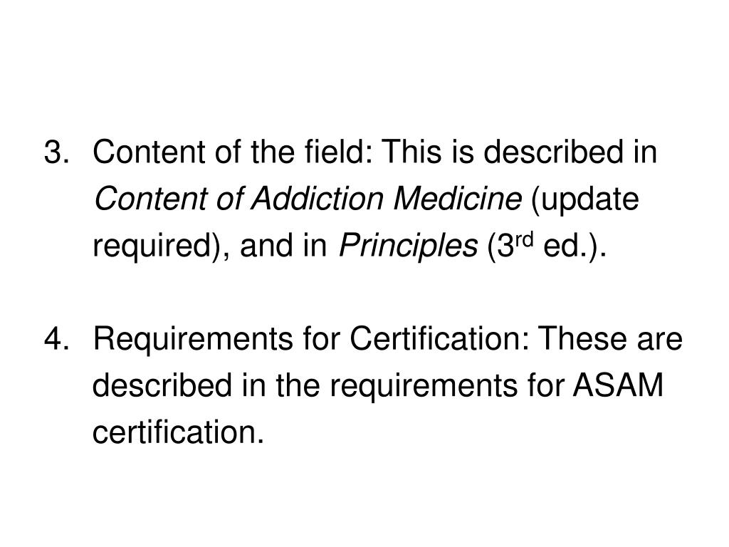 Content of the field: This is described in Content of Addiction Medicine (update required), and in Principles (3rd ed.). • Requirements for Certification: These are described in the requirements for ASAM certification.