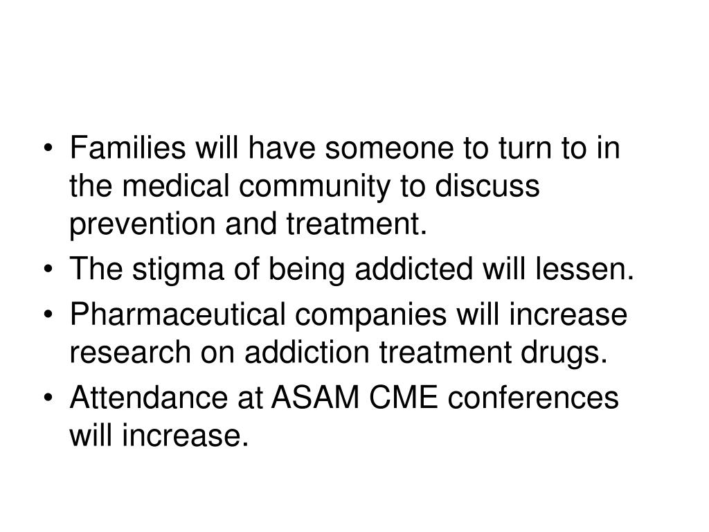 Families will have someone to turn to in the medical community to discuss prevention and treatment. • The stigma of being addicted will lessen. • Pharmaceutical companies will increase research on addiction treatment drugs. • Attendance at ASAM CME conferences will increase.