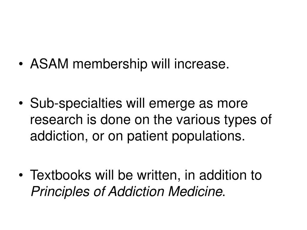 ASAM membership will increase. • Sub-specialties will emerge as more research is done on the various types of addiction, or on patient populations. • Textbooks will be written, in addition to Principles of Addiction Medicine.