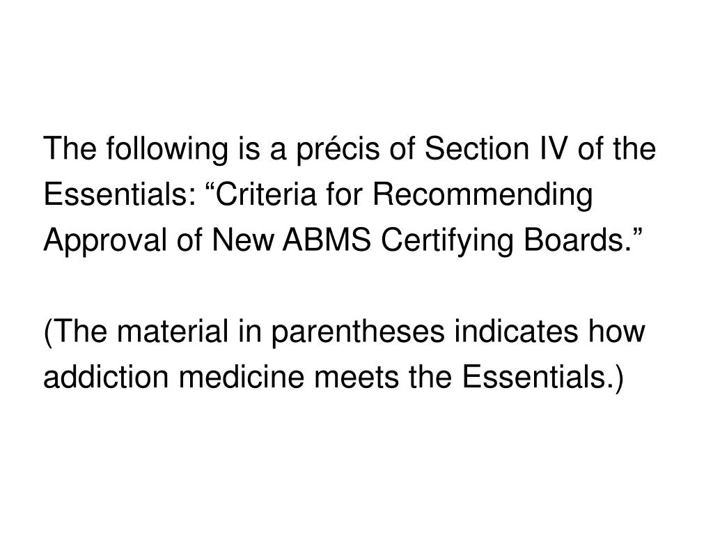 The following is a précis of Section IV of the Essentials: “Criteria for Recommending Approval of New ABMS Certifying Boards.” (The material in parentheses indicates how addiction medicine meets the Essentials.)
