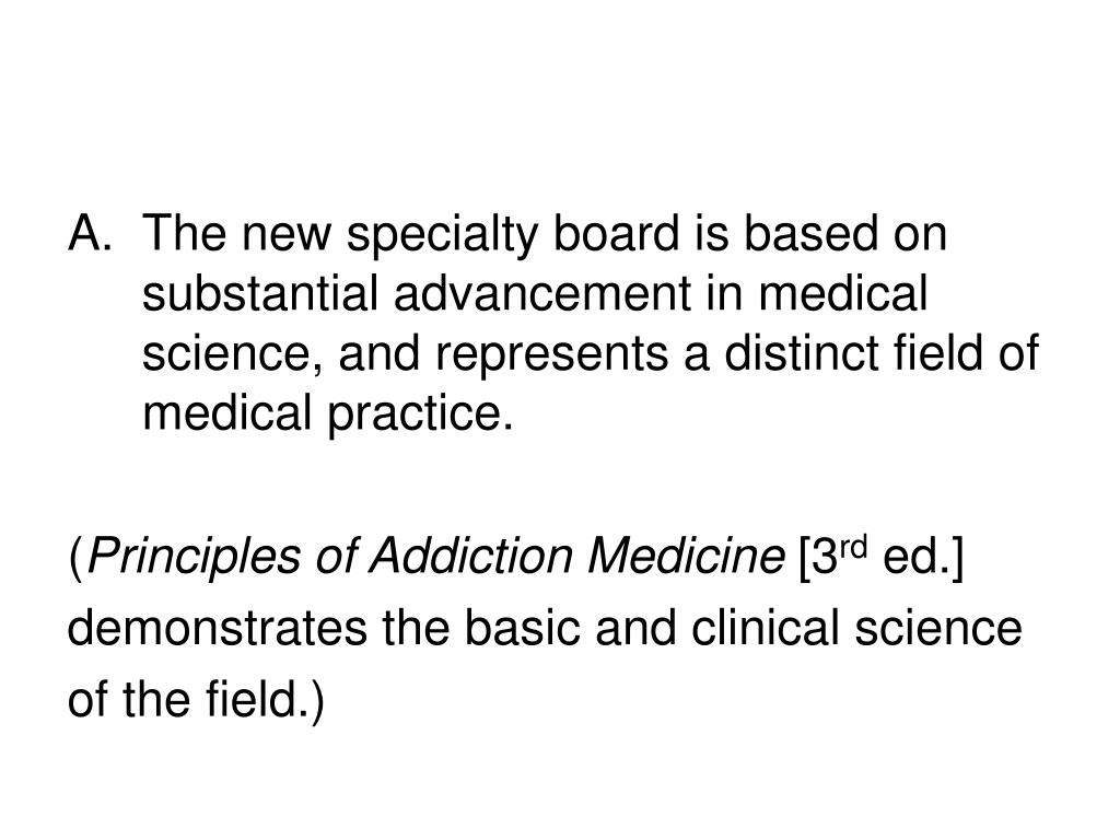 The new specialty board is based on substantial advancement in medical science, and represents a distinct field of medical practice. (Principles of Addiction Medicine [3rd ed.] demonstrates the basic and clinical science of the field.)