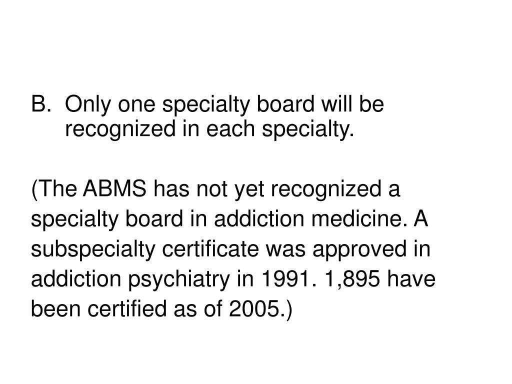 Only one specialty board will be recognized in each specialty. (The ABMS has not yet recognized a specialty board in addiction medicine. A subspecialty certificate was approved in addiction psychiatry in 1991. 1,895 have been certified as of 2005.)