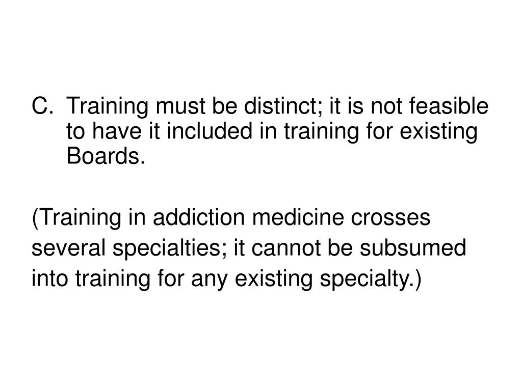 Training must be distinct; it is not feasible to have it included in training for existing Boards. (Training in addiction medicine crosses several specialties; it cannot be subsumed into training for any existing specialty.)
