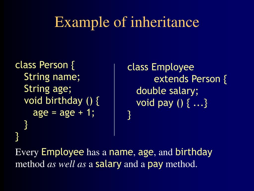 Example of inheritance class Person { String name; String age; void birthday () { age = age + 1; } } class Employee extends Person { double salary; void pay () { ...} } Every Employee has a name, age, and birthday method as well as a salary and a pay method.