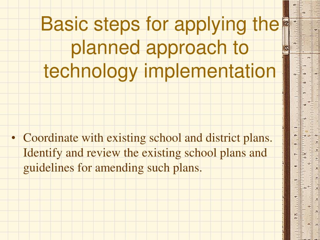 Basic steps for applying the planned approach to technology implementation • Coordinate with existing school and district plans. Identify and review the existing school plans and guidelines for amending such plans.
