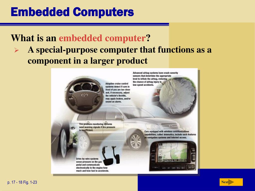 Embedded Computers Next • What is an embedded computer? • A special-purpose computer that functions as a component in a larger product p. 17 - 18 Fig. 1-23