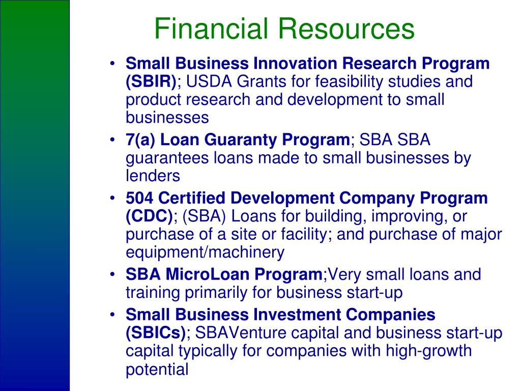 Financial Resources • Small Business Innovation Research Program (SBIR); USDA Grants for feasibility studies and product research and development to small businesses • 7(a) Loan Guaranty Program; SBA SBA guarantees loans made to small businesses by lenders • 504 Certified Development Company Program (CDC); (SBA) Loans for building, improving, or purchase of a site or facility; and purchase of major equipment/machinery • SBA MicroLoan Program;Very small loans and training primarily for business start-up • Small Business Investment Companies (SBICs); SBAVenture capital and business start-up capital typically for companies with high-growth potential