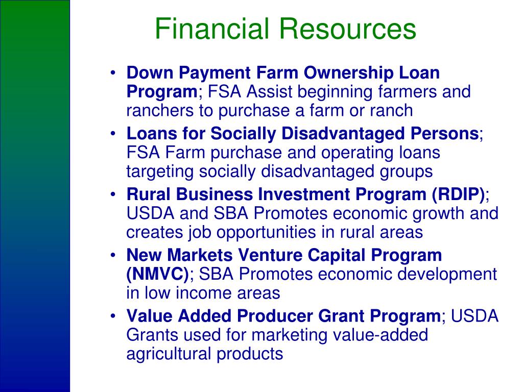 Financial Resources • Down Payment Farm Ownership Loan Program; FSA Assist beginning farmers and ranchers to purchase a farm or ranch • Loans for Socially Disadvantaged Persons; FSA Farm purchase and operating loans targeting socially disadvantaged groups • Rural Business Investment Program (RDIP); USDA and SBA Promotes economic growth and creates job opportunities in rural areas • New Markets Venture Capital Program (NMVC); SBA Promotes economic development in low income areas • Value Added Producer Grant Program; USDA Grants used for marketing value-added agricultural products
