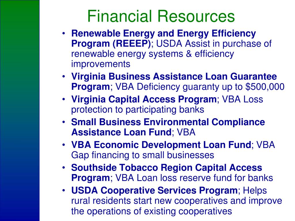 Financial Resources • Renewable Energy and Energy Efficiency Program (REEEP); USDA Assist in purchase of renewable energy systems & efficiency improvements • Virginia Business Assistance Loan Guarantee Program; VBA Deficiency guaranty up to $500,000 • Virginia Capital Access Program; VBA Loss protection to participating banks • Small Business Environmental Compliance Assistance Loan Fund; VBA • VBA Economic Development Loan Fund; VBA Gap financing to small businesses • Southside Tobacco Region Capital Access Program; VBA Loan loss reserve fund for banks • USDA Cooperative Services Program; Helps rural residents start new cooperatives and improve the operations of existing cooperatives