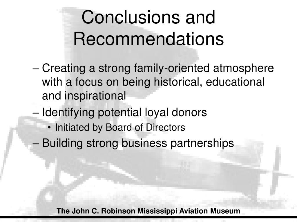 Conclusions and Recommendations • Creating a strong family-oriented atmosphere with a focus on being historical, educational and inspirational • Identifying potential loyal donors • Initiated by Board of Directors • Building strong business partnerships The John C. Robinson Aviation Museum The John C. Robinson Mississippi Aviation Museum