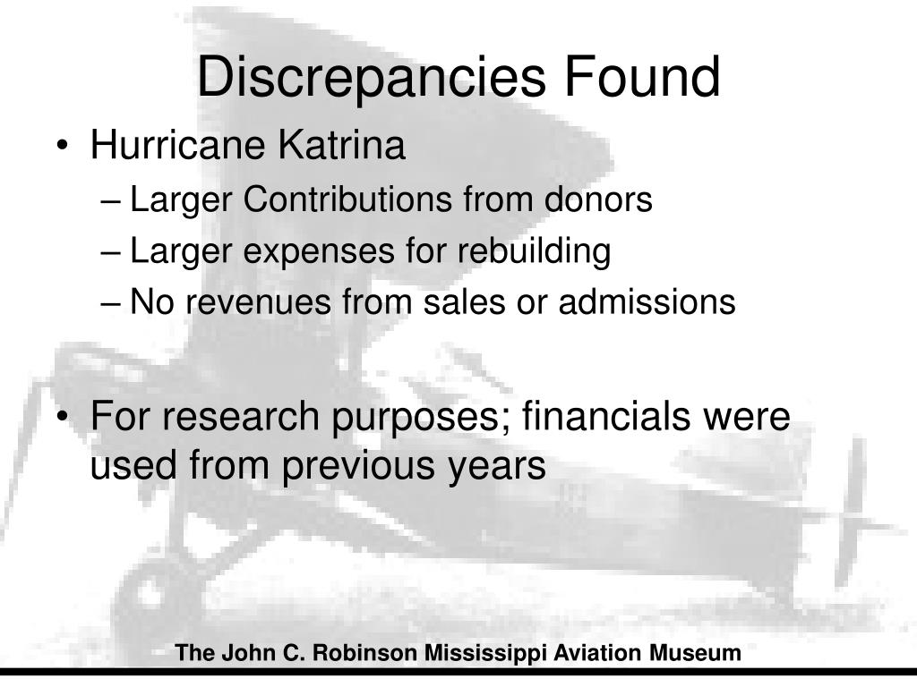 Discrepancies Found • Hurricane Katrina • Larger Contributions from donors • Larger expenses for rebuilding • No revenues from sales or admissions • For research purposes; financials were used from previous years The John C. Robinson Aviation Museum The John C. Robinson Mississippi Aviation Museum