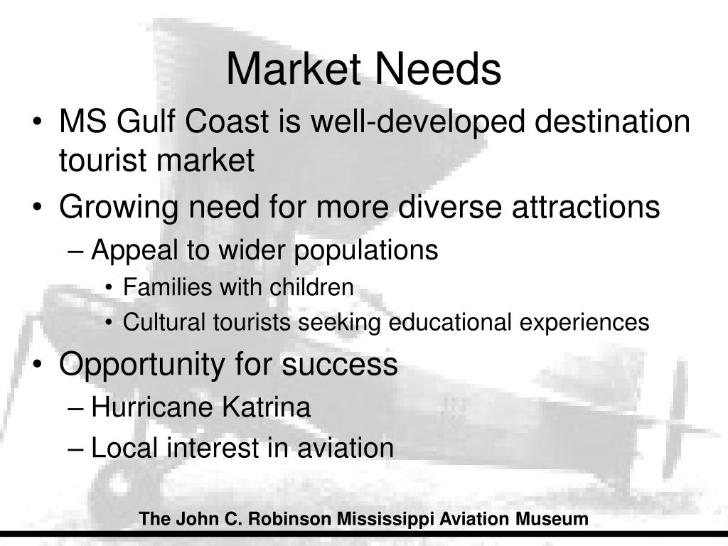 Market Needs • MS Gulf Coast is well-developed destination tourist market • Growing need for more diverse attractions • Appeal to wider populations • Families with children • Cultural tourists seeking educational experiences • Opportunity for success • Hurricane Katrina • Local interest in aviation The John C. Robinson Aviation Museum The John C. Robinson Mississippi Aviation Museum