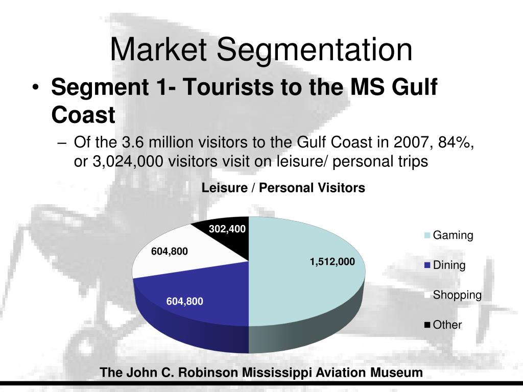 Market Segmentation • Segment 1- Tourists to the MS Gulf Coast • Of the 3.6 million visitors to the Gulf Coast in 2007, 84%, or 3,024,000 visitors visit on leisure/ personal trips The John C. Robinson Aviation Museum The John C. Robinson Mississippi Aviation Museum