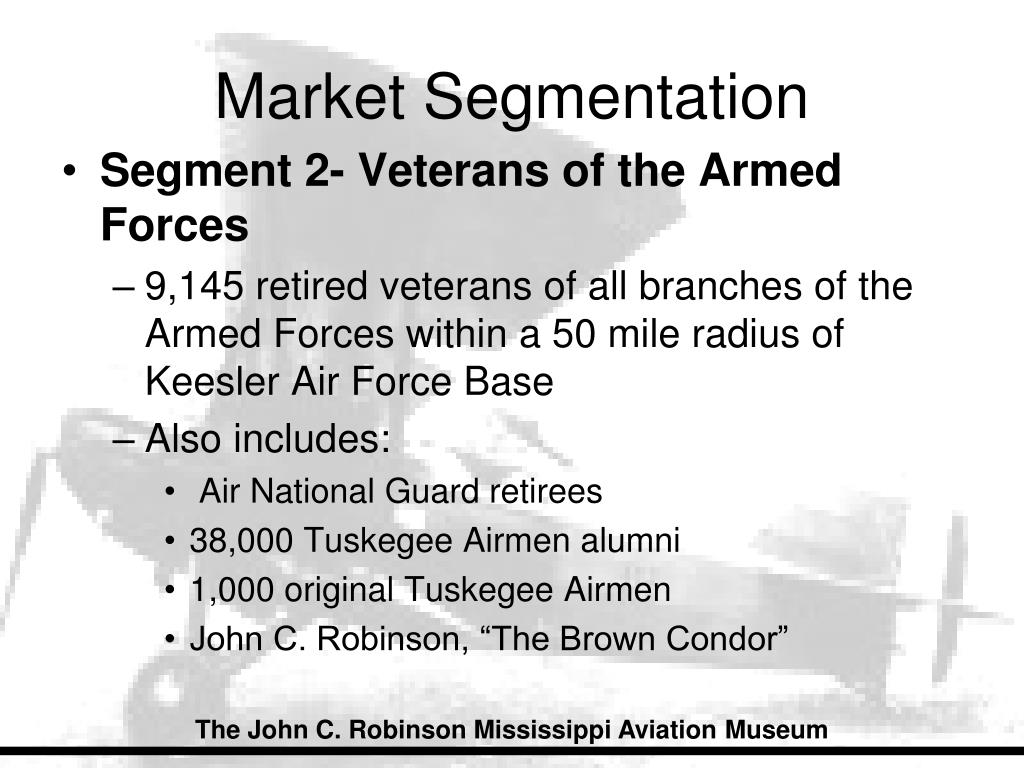 Market Segmentation • Segment 2- Veterans of the Armed Forces • 9,145 retired veterans of all branches of the Armed Forces within a 50 mile radius of Keesler Air Force Base • Also includes: • Air National Guard retirees • 38,000 Tuskegee Airmen alumni • 1,000 original Tuskegee Airmen • John C. Robinson, “The Brown Condor” The John C. Robinson Aviation Museum The John C. Robinson Mississippi Aviation Museum