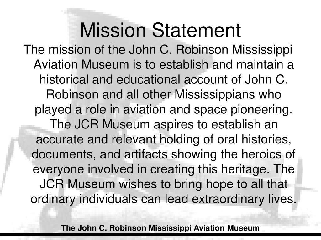 Mission Statement The mission of the John C. Robinson Mississippi Aviation Museum is to establish and maintain a historical and educational account of John C. Robinson and all other Mississippians who played a role in aviation and space pioneering. The JCR Museum aspires to establish an accurate and relevant holding of oral histories, documents, and artifacts showing the heroics of everyone involved in creating this heritage. The JCR Museum wishes to bring hope to all that ordinary individuals can lead extraordinary lives. The John C. Robinson Aviation Museum The John C. Robinson Mississippi Aviation Museum