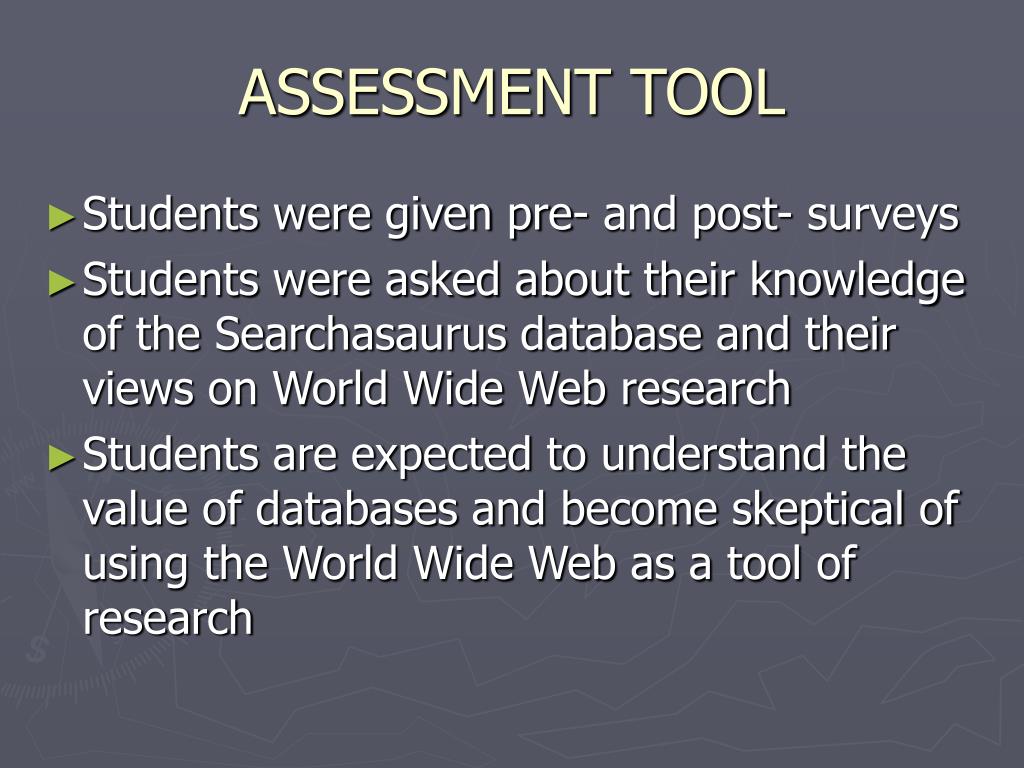 ASSESSMENT TOOL • Students were given pre- and post- surveys • Students were asked about their knowledge of the Searchasaurus database and their views on World Wide Web research • Students are expected to understand the value of databases and become skeptical of using the World Wide Web as a tool of research