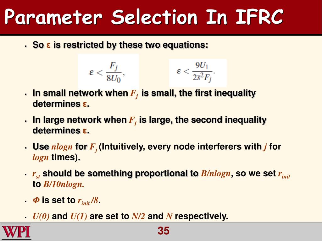 Parameter Selection In IFRC So ε is restricted by these two equations: In small network when Fjis small, the first inequality determines ε. In large network when Fj is large, the second inequality determines ε. Use nlogn for Fj (Intuitively, every node interferers with j for logn times). rst should be something proportional to B/nlogn, so we set rinitto B/10nlogn. Φis set to rinit /8. U(0) and U(1) are set to N/2 and N respectively.