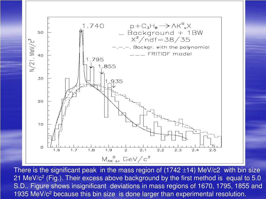 There is the significant peak in the mass region of (1742 14) MeV/c2 with bin size 21 MeV/c2 (Fig.). Their excess above background by the first method is equal to 5.0 S.D.. Figure shows insignificant deviations in mass regions of 1670, 1795, 1855 and 1935 MeV/c2 because this bin size is done larger than experimental resolution.