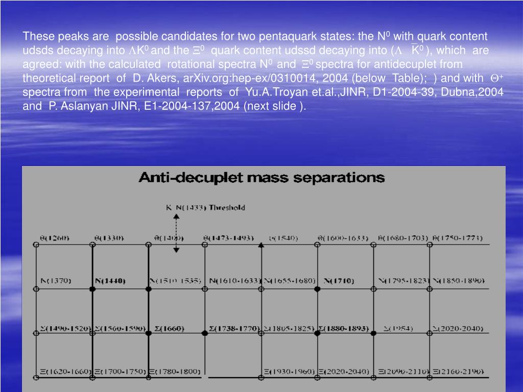 These peaks are possible candidates for two pentaquark states: the N0 with quark content udsds decaying into K0 and the 0 quark content udssd decaying into ( K0 ), which are agreed: with the calculated rotational spectra N0 and0 spectra for antidecuplet from theoretical report of D. Akers, arXiv.org:hep-ex/0310014, 2004 (below Table);)and with + spectra from the experimental reports of Yu.A.Troyan et.al.,JINR, D1-2004-39, Dubna,2004 and P. Aslanyan JINR, E1-2004-137,2004 (next slide ).