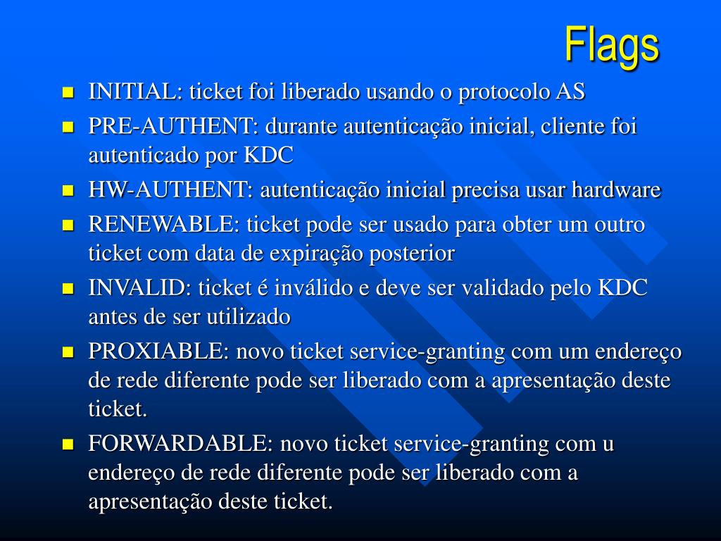 Flags • INITIAL: ticket foi liberado usando o protocolo AS • PRE-AUTHENT: durante autenticação inicial, cliente foi autenticado por KDC • HW-AUTHENT: autenticação inicial precisa usar hardware • RENEWABLE: ticket pode ser usado para obter um outro ticket com data de expiração posterior • INVALID: ticket é inválido e deve ser validado pelo KDC antes de ser utilizado • PROXIABLE: novo ticket service-granting com um endereço de rede diferente pode ser liberado com a apresentação deste ticket. • FORWARDABLE: novo ticket service-granting com u endereço de rede diferente pode ser liberado com a apresentação deste ticket.