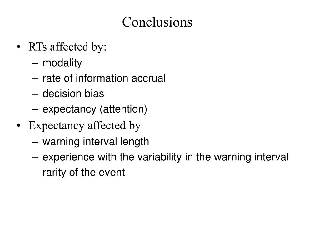 Conclusions • RTs affected by: • modality • rate of information accrual • decision bias • expectancy (attention) • Expectancy affected by • warning interval length • experience with the variability in the warning interval • rarity of the event