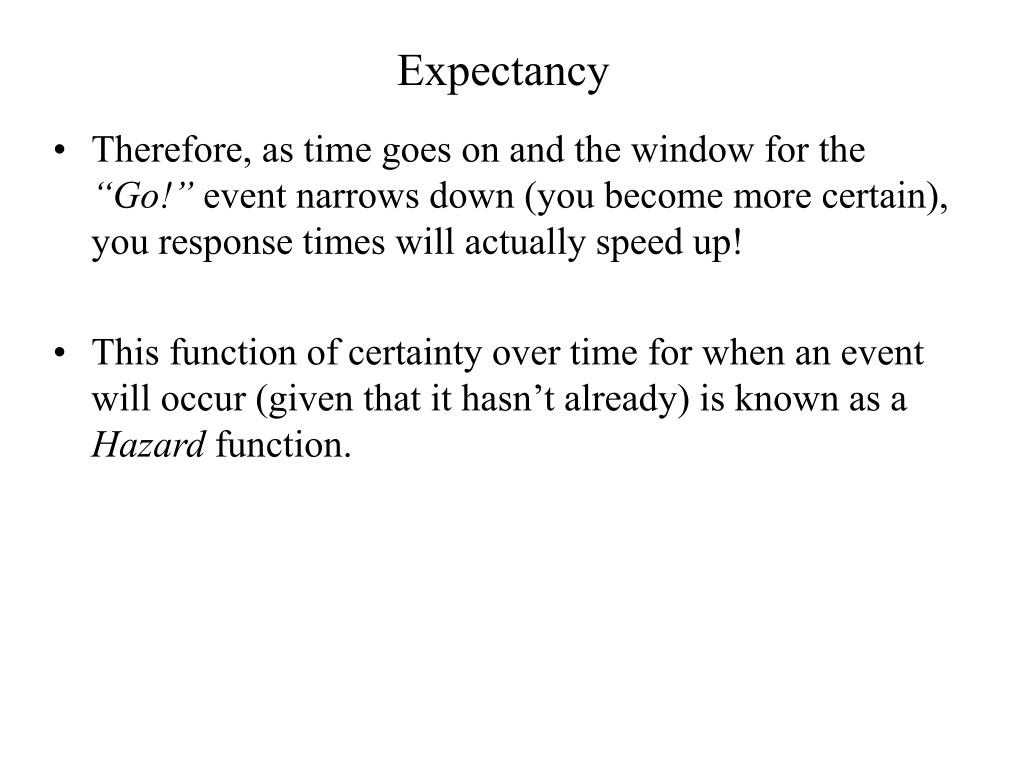 Expectancy • Therefore, as time goes on and the window for the “Go!” event narrows down (you become more certain), you response times will actually speed up! • This function of certainty over time for when an event will occur (given that it hasn’t already) is known as a Hazard function.