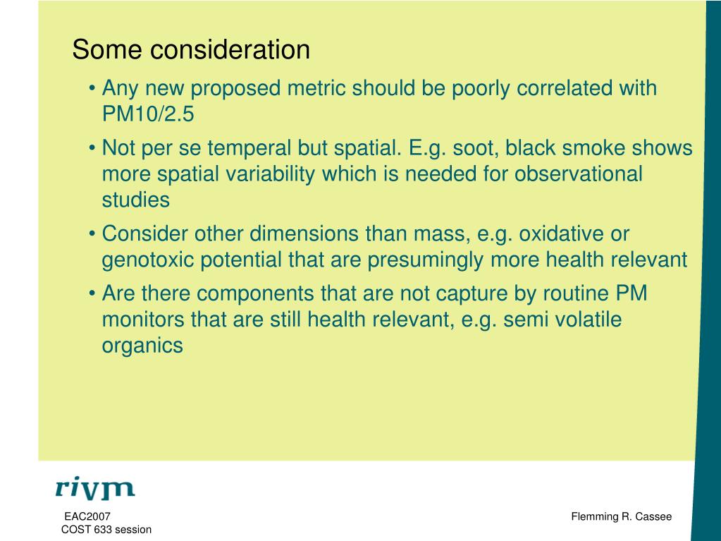 Some consideration • Any new proposed metric should be poorly correlated with PM10/2.5 • Not per se temperal but spatial. E.g. soot, black smoke shows more spatial variability which is needed for observational studies • Consider other dimensions than mass, e.g. oxidative or genotoxic potential that are presumingly more health relevant • Are there components that are not capture by routine PM monitors that are still health relevant, e.g. semi volatile organics