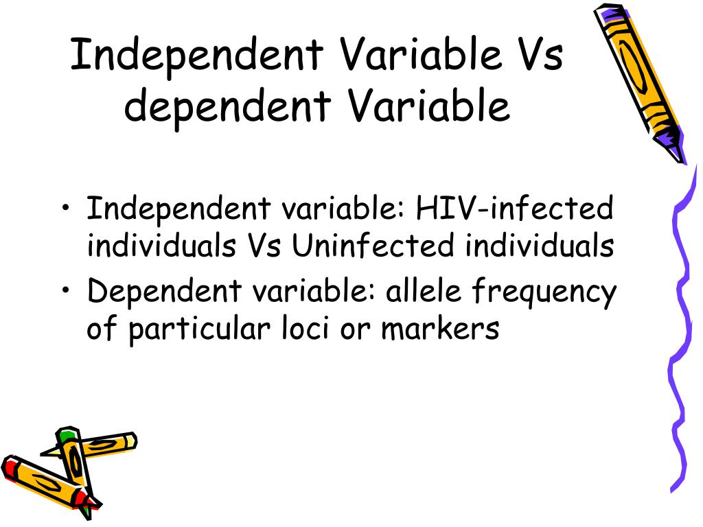 Differences In Allele & Genotype Frequencies B/W HIV (+) & HIV (-). Djenny Batrony. Independent Variable Vs dependent Variable. Independent variable: HIV-infected individuals Vs Uninfected individuals Dependent variable: allele frequency of particular loci or markers.