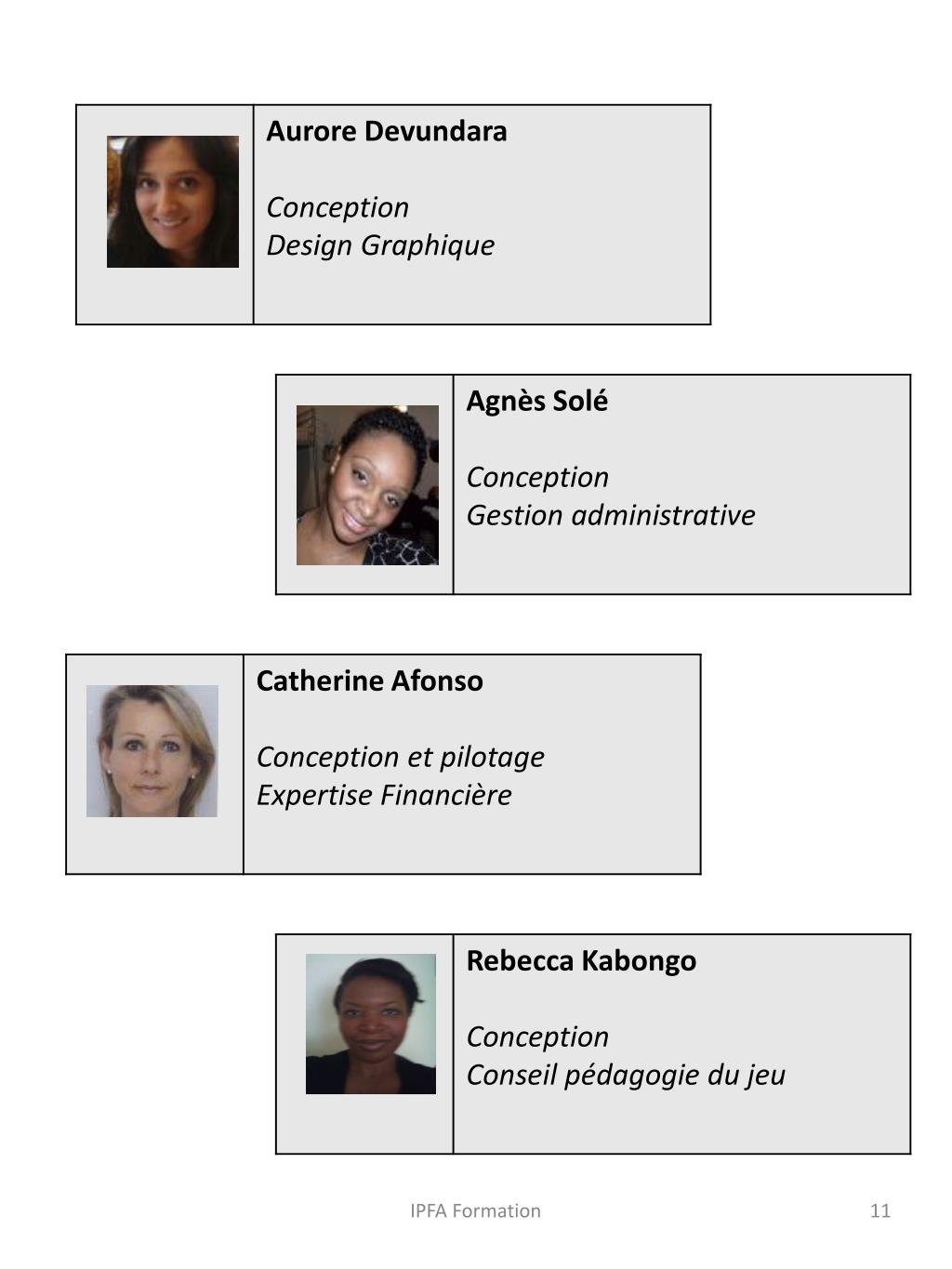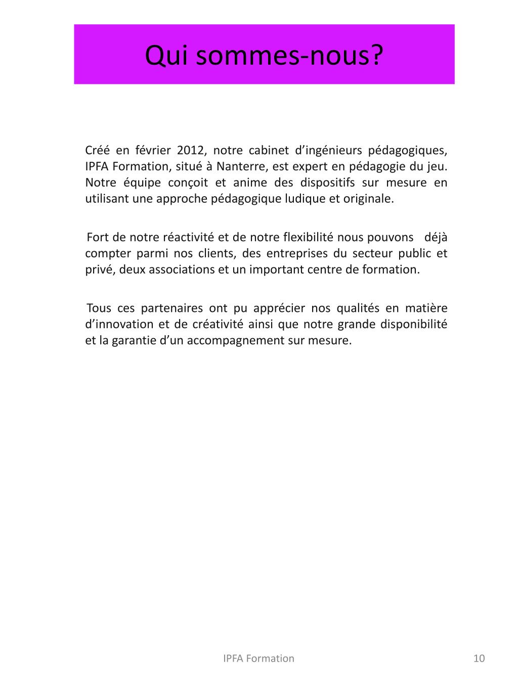 Qui sommes-nous? Créé en février 2012, notre cabinet d’ingénieurs pédagogiques, IPFA Formation, situé à Nanterre, est expert en pédagogie du jeu. Notre équipe conçoit et anime des dispositifs sur mesure en utilisant une approche pédagogique ludique et originale. Fort de notre réactivité et de notre flexibilité nous pouvons déjà compter parmi nos clients, des entreprises du secteur public et privé, deux associations et un important centre de formation. Tous ces partenaires ont pu apprécier nos qualités en matière d’innovation et de créativité ainsi que notre grande disponibilité et la garantie d’un accompagnement sur mesure. IPFA Formation