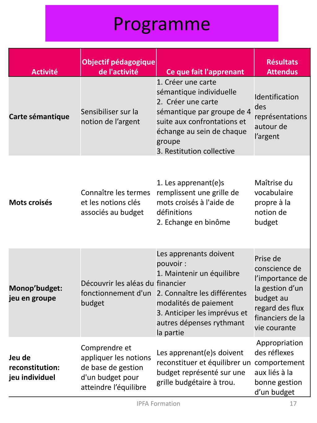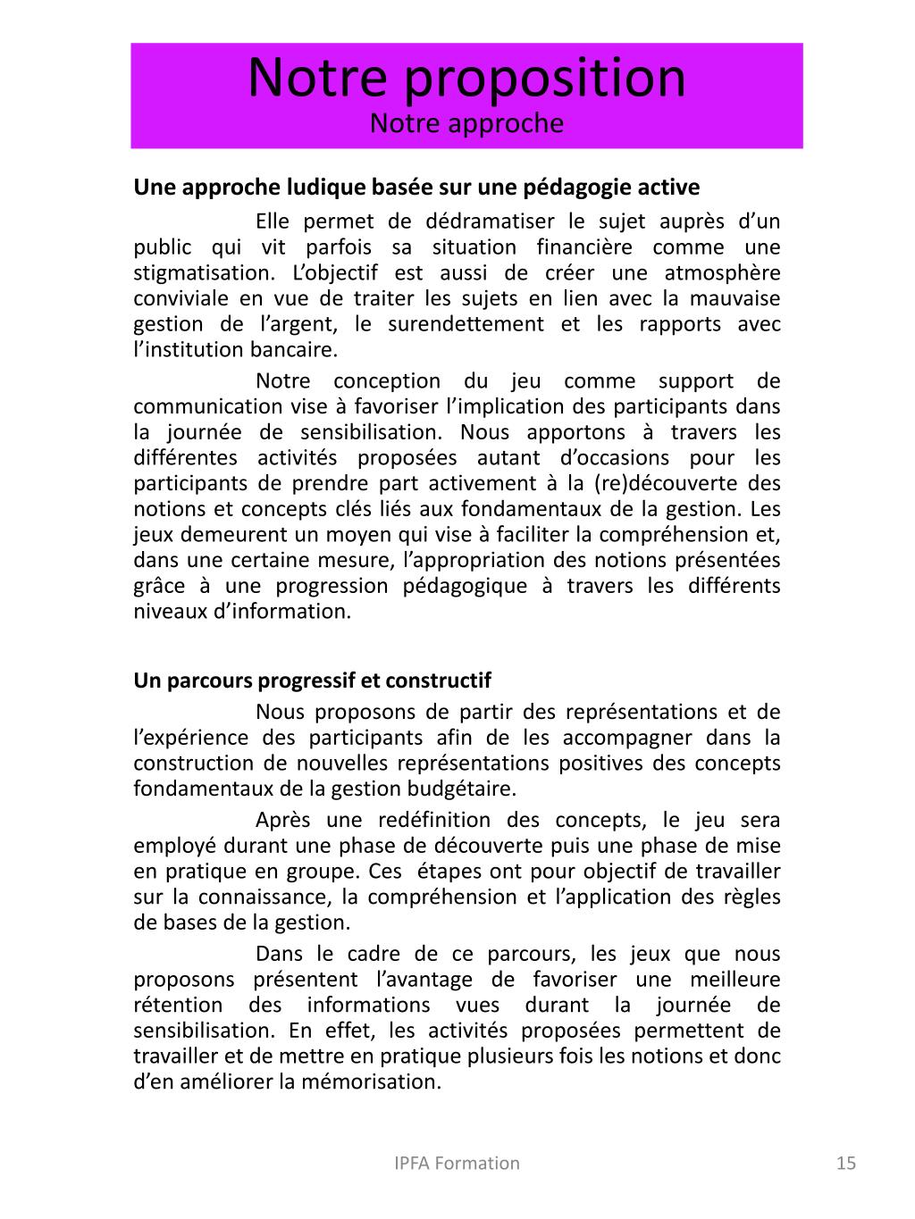 Notre propositionNotre approche Une approche ludique basée sur une pédagogie active Elle permet de dédramatiser le sujet auprès d’un public qui vit parfois sa situation financière comme une stigmatisation. L’objectif est aussi de créer une atmosphère conviviale en vue de traiter les sujets en lien avec la mauvaise gestion de l’argent, le surendettement et les rapports avec l’institution bancaire. Notre conception du jeu comme support de communication vise à favoriser l’implication des participants dans la journée de sensibilisation. Nous apportons à travers les différentes activités proposées autant d’occasions pour les participants de prendre part activement à la (re)découverte des notions et concepts clés liés aux fondamentaux de la gestion. Les jeux demeurent un moyen qui vise à faciliter la compréhension et, dans une certaine mesure, l’appropriation des notions présentées grâce à une progression pédagogique à travers les différents niveaux d’information. Un parcours progressif et constructif Nous proposons de partir des représentations et de l’expérience des participants afin de les accompagner dans la construction de nouvelles représentations positives des concepts fondamentaux de la gestion budgétaire. Après une redéfinition des concepts, le jeu sera employé durant une phase de découverte puis une phase de mise en pratique en groupe. Ces étapes ont pour objectif de travailler sur la connaissance, la compréhension et l’application des règles de bases de la gestion. Dans le cadre de ce parcours, les jeux que nous proposons présentent l’avantage de favoriser une meilleure rétention des informations vues durant la journée de sensibilisation. En effet, les activités proposées permettent de travailler et de mettre en pratique plusieurs fois les notions et donc d’en améliorer la mémorisation. IPFA Formation