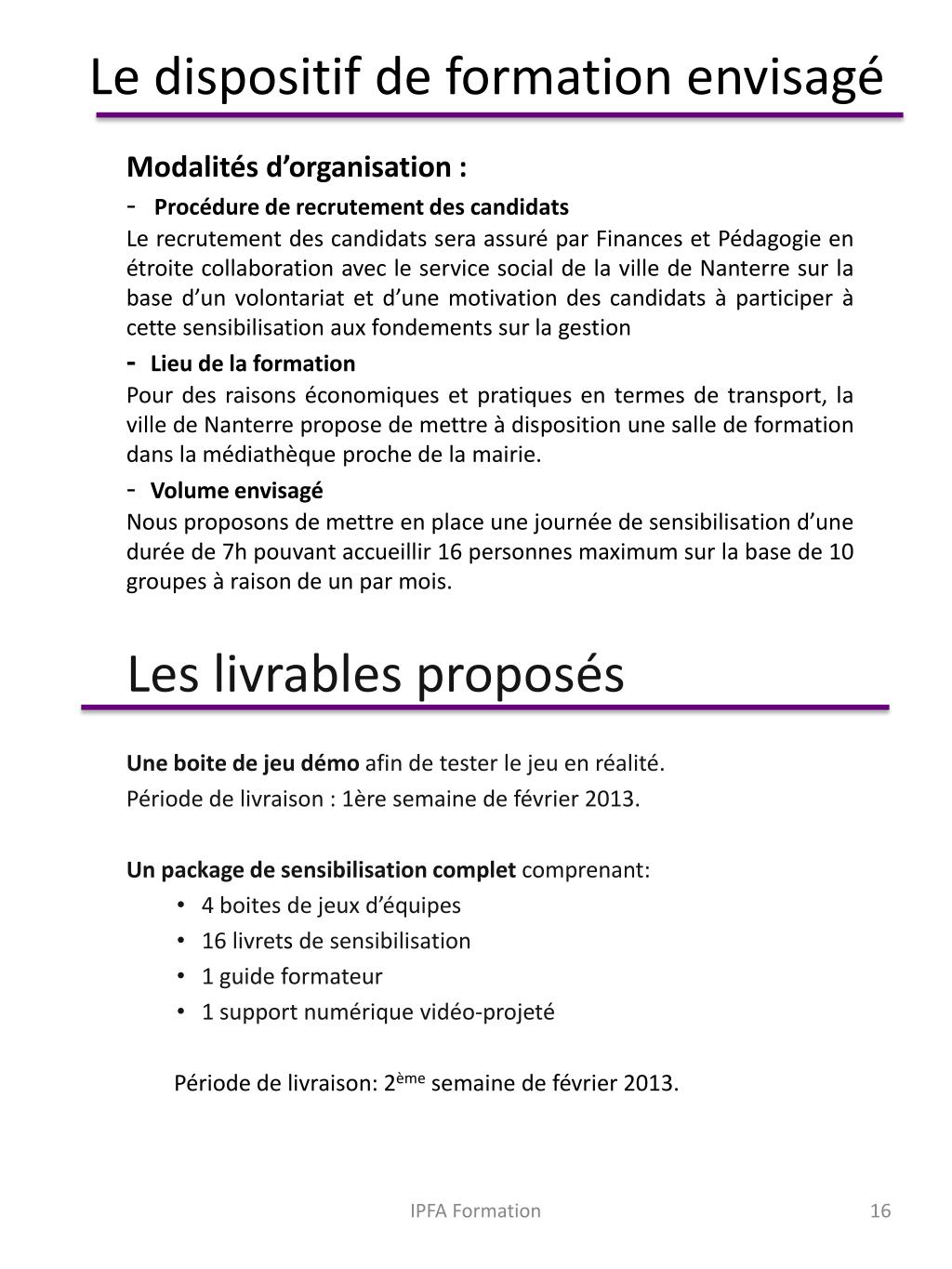 Le dispositif de formation envisagé • Modalités d’organisation : • - Procédure de recrutement des candidats • Le recrutement des candidats sera assuré par Finances et Pédagogie en étroite collaboration avec le service social de la ville de Nanterre sur la base d’un volontariat et d’une motivation des candidats à participer à cette sensibilisation aux fondements sur la gestion • - Lieu de la formation • Pour des raisons économiques et pratiques en termes de transport, la ville de Nanterre propose de mettre à disposition une salle de formation dans la médiathèque proche de la mairie. • - Volume envisagé • Nous proposons de mettre en place une journée de sensibilisation d’une durée de 7h pouvant accueillir 16 personnes maximum sur la base de 10 groupes à raison de un par mois. • Les livrables proposés • Une boite de jeu démo afin de tester le jeu en réalité. • Période de livraison : 1ère semaine de février 2013. • Un package de sensibilisation complet comprenant: • 4 boites de jeux d’équipes • 16 livrets de sensibilisation • 1 guide formateur • 1 support numérique vidéo-projeté • Période de livraison: 2ème semaine de février 2013. IPFA Formation