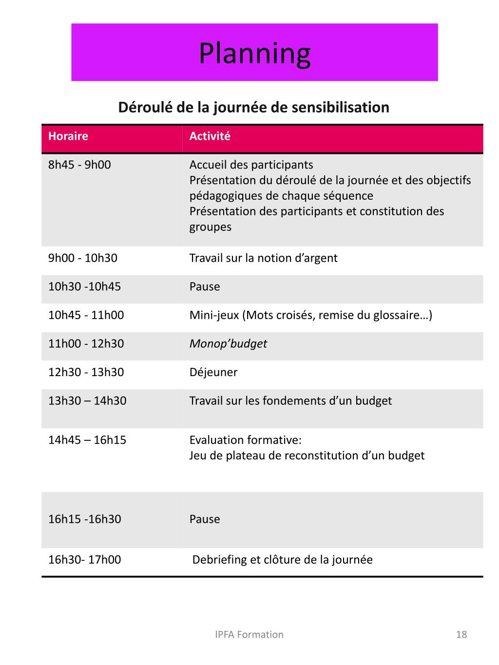 Planning Déroulé de la journée de sensibilisation IPFA Formation