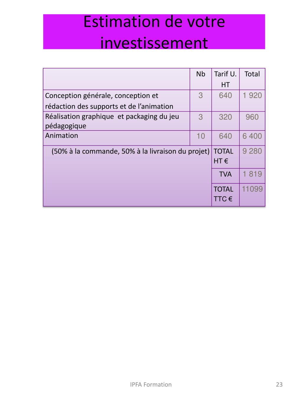 Estimation de votre investissement • Les frais de graphisme et de packaging du jeu pédagogique réalisé sur mesure incluent la matière première, l’outillage et la main d’œuvre. • Le prix de l’animation s’entend pour un nombre de 16 participants par groupe au maximum et sous réserve de votre engagement pour un groupe minimum par mois sur 10 mois. • Cette proposition n’inclut pas nos frais de restauration et de déplacement. • Le recrutement et positionnement des participants sont assurés par Finances & Pédagogie. • Les frais de restauration des participants ne sont pas pris en charge. • Le tarif jour proposé permet de supporter une facturation à votre commanditaire de 12 à 15 €h par stagiaire. • Nous vous assurons que le créateur du jeu pédagogique animera personnellement les journées de sensibilisation. • A l’issue de nos prestations d’animation, les créations du jeu pédagogique deviendront votre propriété. • Nous pourrons assurer l’accompagnement d’un formateur à l’issue de notre mission. IPFA Formation