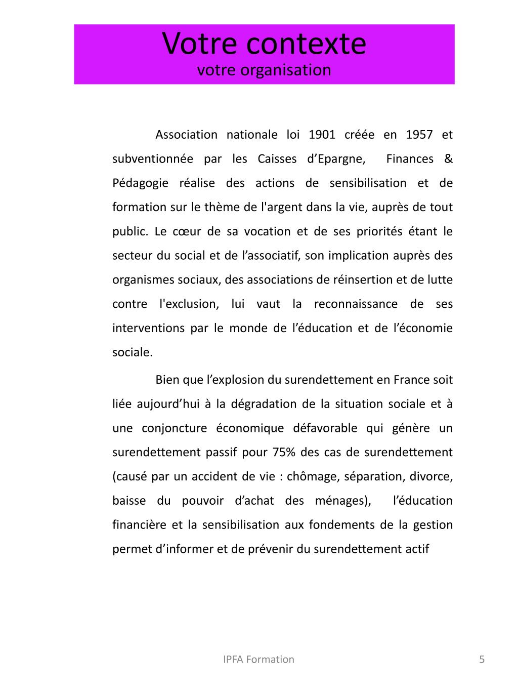 Votre contextevotre organisation Association nationale loi 1901 créée en 1957 et subventionnée par les Caisses d’Epargne, Finances & Pédagogie réalise des actions de sensibilisation et de formation sur le thème de l'argent dans la vie, auprès de tout public. Le cœur de sa vocation et de ses priorités étant le secteur du social et de l’associatif, son implication auprès des organismes sociaux, des associations de réinsertion et de lutte contre l'exclusion, lui vaut la reconnaissance de ses interventions par le monde de l’éducation et de l’économie sociale. Bien que l’explosion du surendettement en France soit liée aujourd’hui à la dégradation de la situation sociale et à une conjoncture économique défavorable qui génère un surendettement passif pour 75% des cas de surendettement (causé par un accident de vie : chômage, séparation, divorce, baisse du pouvoir d’achat des ménages), l’éducation financière et la sensibilisation aux fondements de la gestion permet d’informer et de prévenir du surendettement actif IPFA Formation