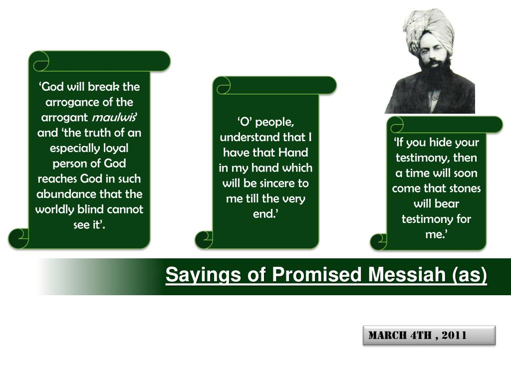 ‘God will break the arrogance of the arrogantmaulwis’ and ‘the truth of an especially loyal person of God reaches God in such abundance that the worldly blind cannot see it’. ‘O’ people, understand that I have that Hand in my hand which will be sincere to me till the very end.’ ‘If you hide your testimony, then a time will soon come that stones will bear testimony for me.’ Sayings of Promised Messiah (as) March 4th , 2011