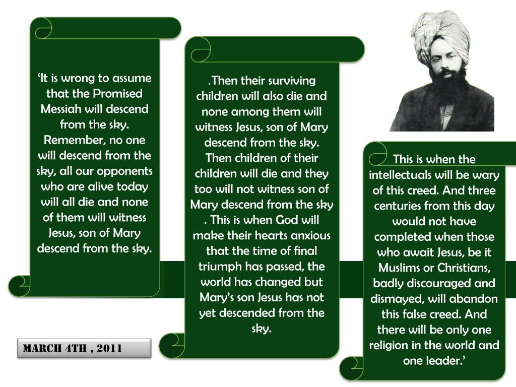 ‘It is wrong to assume that the Promised Messiah will descend from the sky. Remember, no one will descend from the sky, all our opponents who are alive today will all die and none of them will witness Jesus, son of Mary descend from the sky. .Then their surviving children will also die and none among them will witness Jesus, son of Mary descend from the sky. Then children of their children will die and they too will not witness son of Mary descend from the sky . This is when God will make their hearts anxious that the time of final triumph has passed, the world has changed but Mary’s son Jesus has not yet descended from the sky. This is when the intellectuals will be wary of this creed. And three centuries from this day would not have completed when those who await Jesus, be it Muslims or Christians, badly discouraged and dismayed, will abandon this false creed. And there will be only one religion in the world and one leader.’ S March 4th , 2011