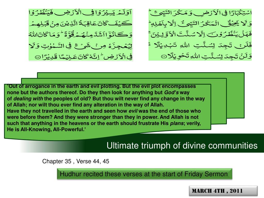 ‘Out of arrogance in the earth and evil plotting. But the evil plot encompasses none but the authors thereof. Do they then look for anything but God’s way of dealing with the peoples of old? But thou wilt never find any change in the way of Allah; nor wilt thou ever find any alteration in the way of Allah. Have they not travelled in the earth and seen how evil was the end of those who were before them? And they were stronger than they in power. And Allah is not such that anything in the heavens or the earth should frustrate His plans; verily, He is All-Knowing, All-Powerful.’ Ultimate triumph of divine communities Chapter 35 , Verse 44, 45 Hudhurrecited these verses at the start of Friday Sermon March 4th , 2011
