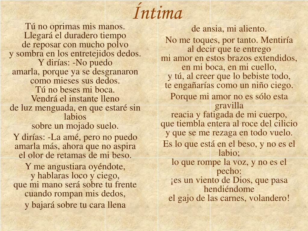 Íntima de ansia, mi aliento. No me toques, por tanto. Mentiría al decir que te entrego mi amor en estos brazos extendidos,en mi boca, en mi cuello, y tú, al creer que lo bebiste todo,te engañarías como un niño ciego. Porque mi amor no es sólo esta gravilla reacia y fatigada de mi cuerpo, que tiembla entera al roce del cilicioy que se me rezaga en todo vuelo. Es lo que está en el beso, y no es el labio; lo que rompe la voz, y no es el pecho: ¡es un viento de Dios, que pasa hendiéndome el gajo de las carnes, volandero! Tú no oprimas mis manos.Llegará el duradero tiempo de reposar con mucho polvo y sombra en los entretejidos dedos.Y dirías: -No puedo amarla, porque ya se desgranaroncomo mieses sus dedos. Tú no beses mi boca. Vendrá el instante lleno de luz menguada, en que estaré sin labios sobre un mojado suelo. Y dirías: -La amé, pero no puedo amarla más, ahora que no aspira el olor de retamas de mi beso. Y me angustiara oyéndote, y hablaras loco y ciego, que mi mano será sobre tu frentecuando rompan mis dedos, y bajará sobre tu cara llena