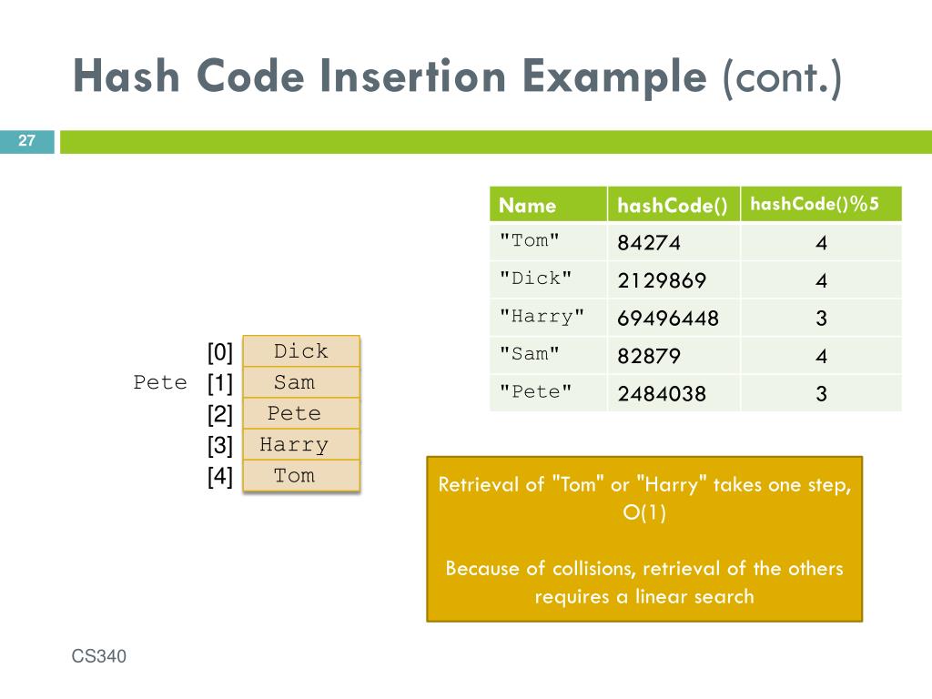 Hash Code Insertion Example Tom Dick Harry Sam Pete [0] [1] Tom [2] [3] [4] CS340