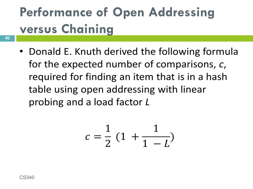 Performance of Open Addressing versus Chaining (cont.) • Using chaining, if an item is in the table, on average we must examine the table element corresponding to the item’s hash code and then half of the items in each list • The average number of items in a list is L, the number of items divided by the table size c = 1 + CS340