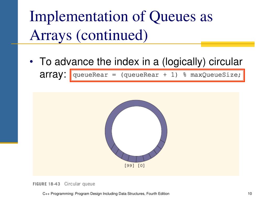 Implementation of Queues as Arrays (continued) • To advance the index in a (logically) circular array: C++ Programming: Program Design Including Data Structures, Fourth Edition