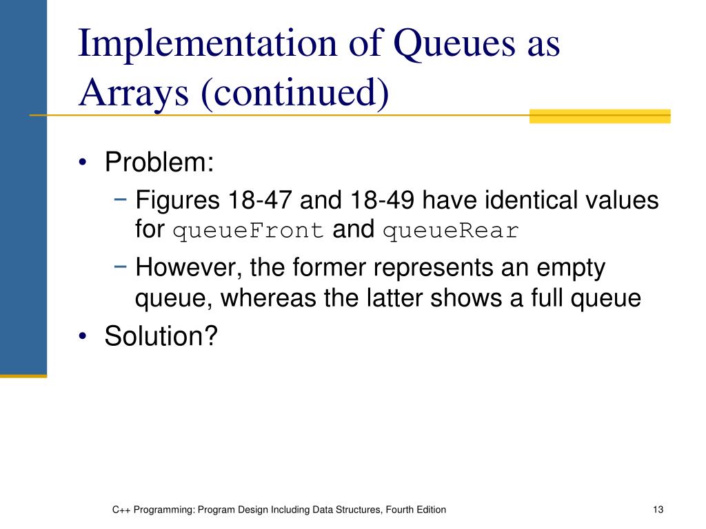 Implementation of Queues as Arrays (continued) • Problem: • Figures 18-47 and 18-49 have identical values for queueFront and queueRear • However, the former represents an empty queue, whereas the latter shows a full queue • Solution? C++ Programming: Program Design Including Data Structures, Fourth Edition