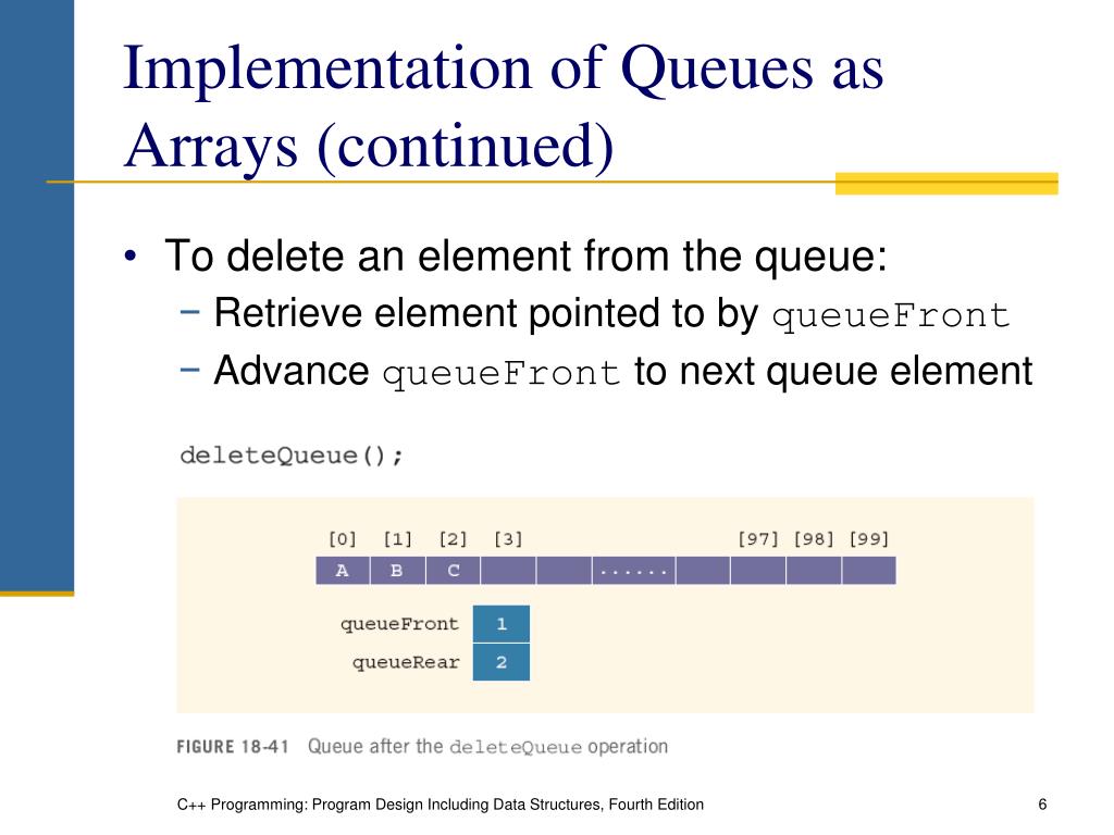 Implementation of Queues as Arrays (continued) • To delete an element from the queue: • Retrieve element pointed to by queueFront • Advance queueFront to next queue element C++ Programming: Program Design Including Data Structures, Fourth Edition