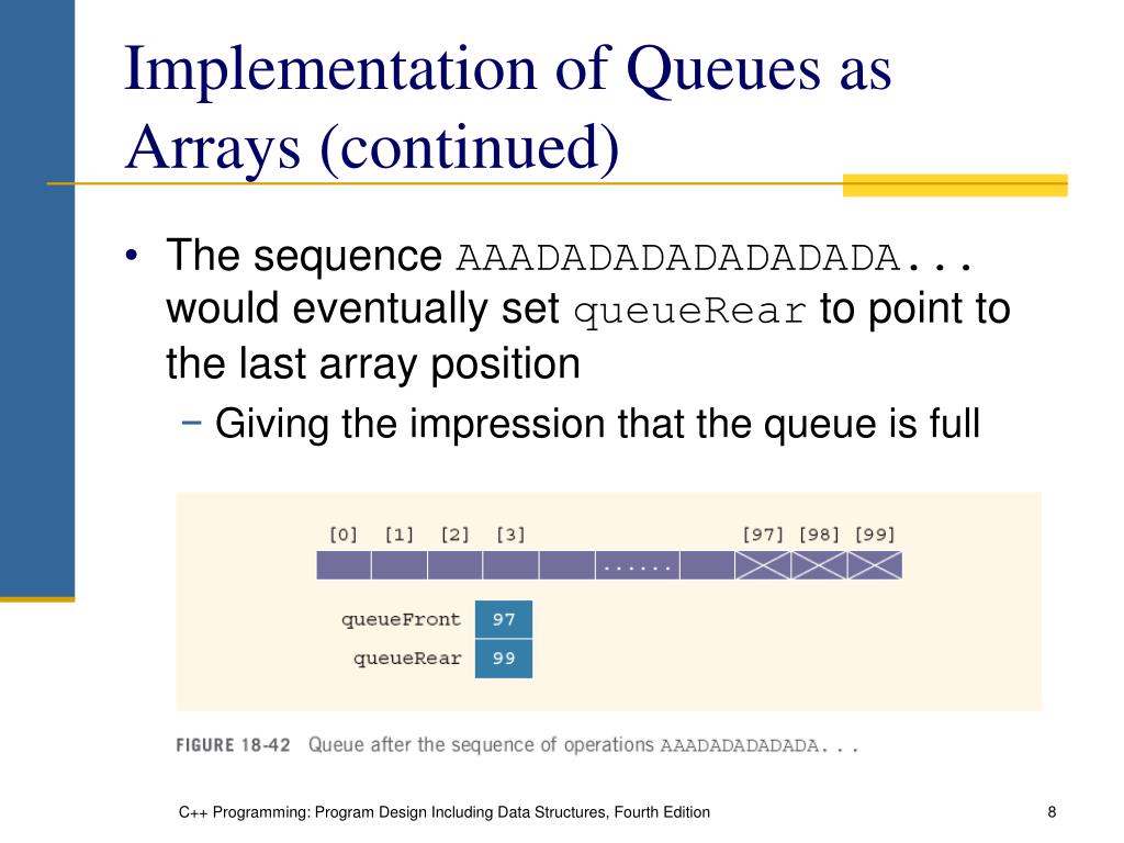 Implementation of Queues as Arrays (continued) • Will this queue design work? • Suppose A stands for adding an element to the queue • And D stands for deleting an element from the queue • Consider the following sequence of operations: • AAADADADADADADADA... C++ Programming: Program Design Including Data Structures, Fourth Edition