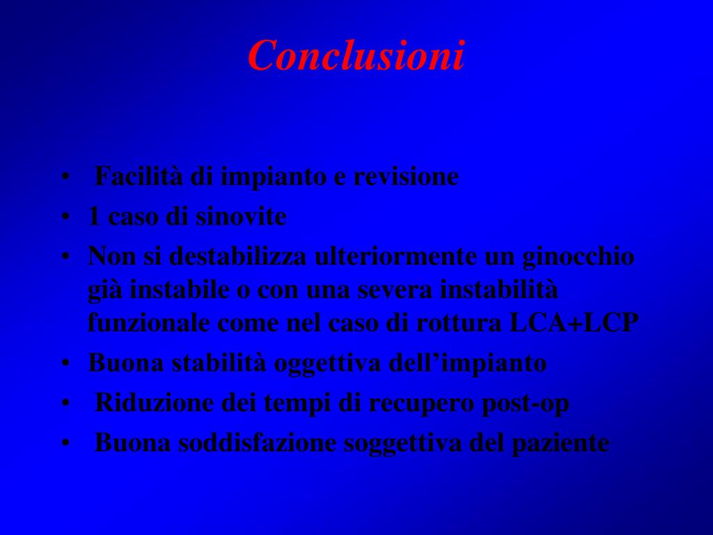 Conclusioni • Facilità di impianto e revisione • 1 caso di sinovite • Non si destabilizza ulteriormente un ginocchio già instabile o con una severa instabilità funzionale come nel caso di rottura LCA+LCP • Buona stabilità oggettiva dell’impianto • Riduzione dei tempi di recupero post-op • Buona soddisfazione soggettiva del paziente